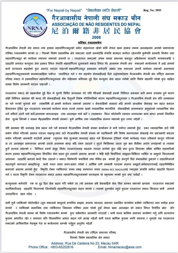 महावाणिज्य दूतावासका कर्मचारी आएको समयमा मात्रै कन्सुलर सेवा स्वयम् कर्मचारीबाट उपलब्ध गराइने गरिएको भन्दै एनआरएनए मकाउले आफ्नो भूमिका नरहेको स्पष्ट पारेको छ ।